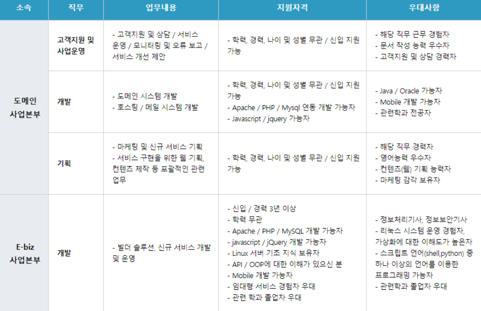 ✔️ 사업본부 : 도메인 사업본부, E-biz 사업본부, 기업부설 연구소, 경영지원본부