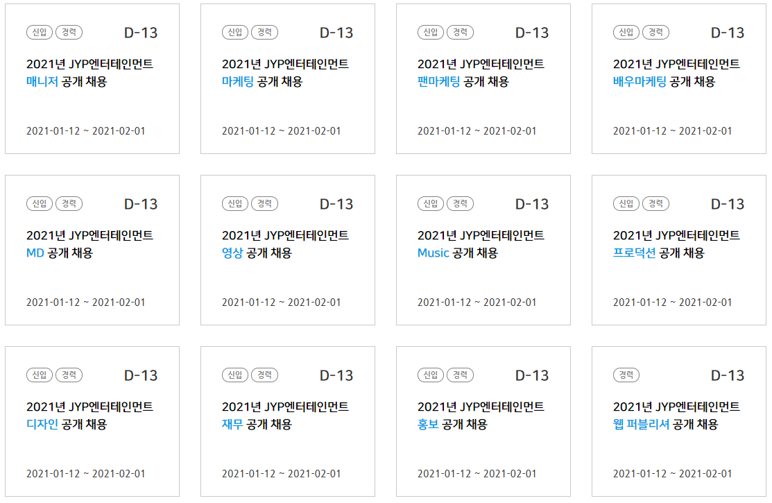 JYP 엔터테인먼트에서 2021년 상반기 신입/경력 사원을 모집합니다!