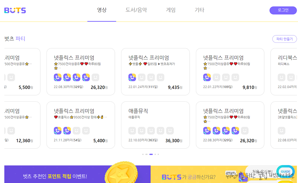 벗츠는 넷플릭스 등 영상 OTT 뿐만 아니라 리디북스, 애플뮤직 같은 도서/음악 구독 서비스, 닌텐도 온라인, 스팀 등 게임 구독 서비스, 오피스나 네이버 등 기타 플랫폼까지 서비스한다는 특징이 있어요.🔫
