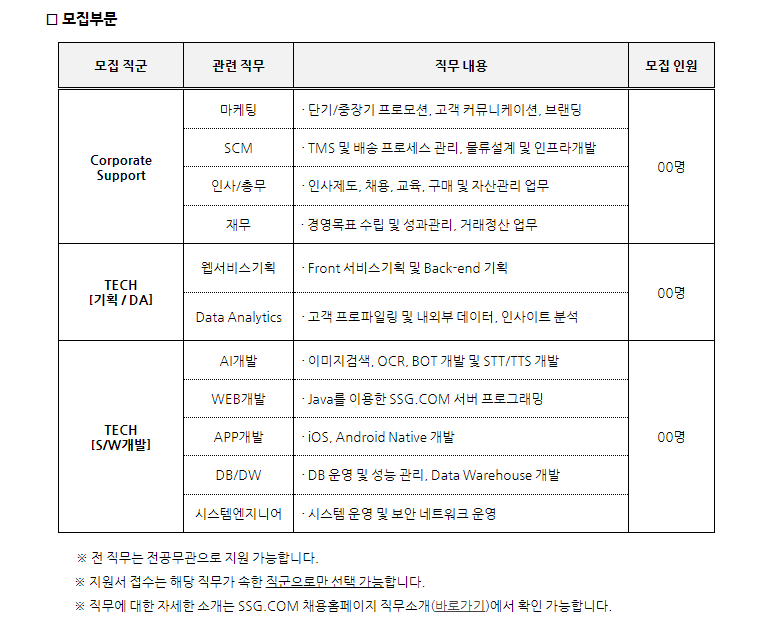 ✔️ 채용부문 : Corporate Support(마케팅, SCM, 인사/총무, 재무), TECH[기획/DA](웹서비스 기획, Data Analytics), TECH[S/W개발](AI개발, WEB개발, APP개발, DB/DW, 시스템엔지니어)