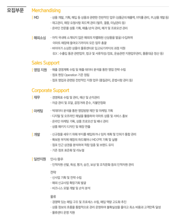 ✔️ 채용부문 : Merchandising(MD, 해외소싱), Sales Support(영업지원), Corporate Support(재무, 마케팅, 개발, 일반지원)