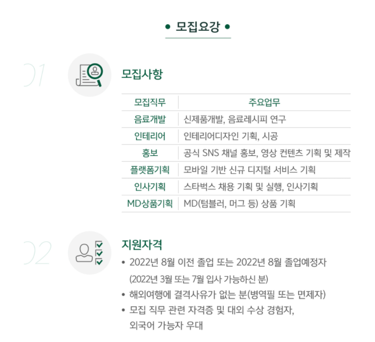 ✔️ 채용부문 : 음료개발(신제품 개발, 음료 레시피 연구), 인테리어(인테리어 디자인 기획, 시공), 홍보(공식 SNS 채널 홍보, 영상 컨텐츠 기획 및 제작), 플랫폼 기획(모바일 기반 신규 디지털 서비스 기획), 인사기획(스타벅스 채용 기획 및 실행, 인사기획), MD상품 기획(MD 상품 기획)