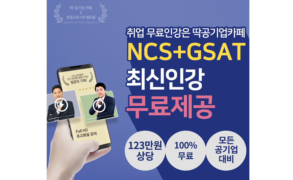네이버 딱공기업 카페에서도 에듀윌과 제휴해 NCS 인강을 무료 제공하고 있습니다. 공무원 취업으로 유명한(눈 감으면 들리는 바로 그 로고송..) 에듀윌이 최근 대기업/공기업 취업시장에도 본격적으로 진출했는데요. 이미 교재 시장에서는 에듀윌 노랑이가 어렵지만 괜찮은 교재로 유명하죠.
