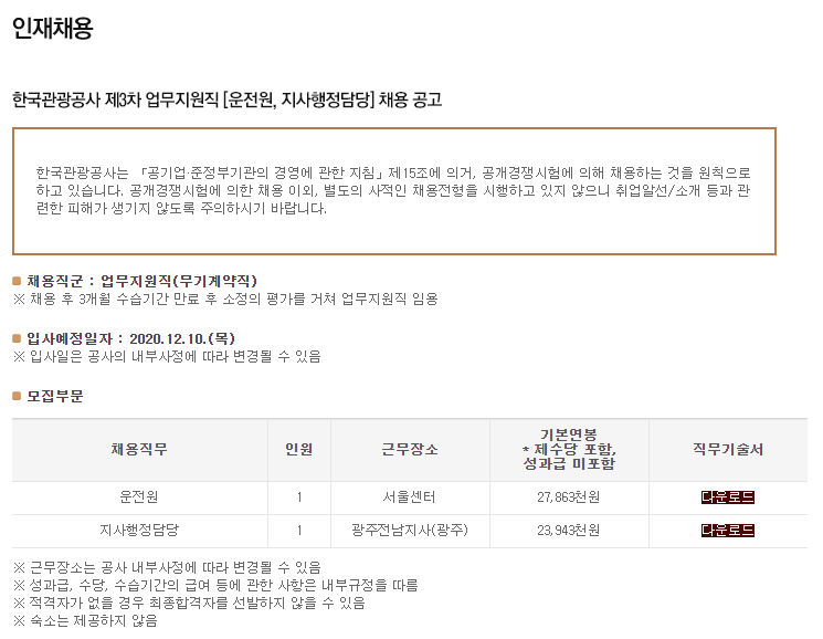 2020년 한국관광공사 제3차 업무지원직[지사행정담당자, 운전원] 채용공고 | 채용공고 | 인재채용