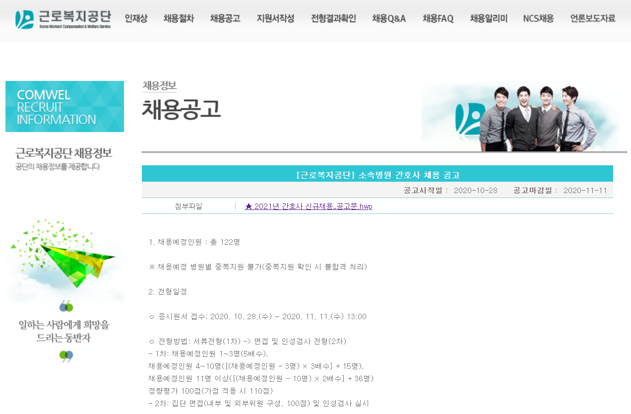 근로복지공단에서 소속 병원 간호사(간호직 6급)를 모집합니다!